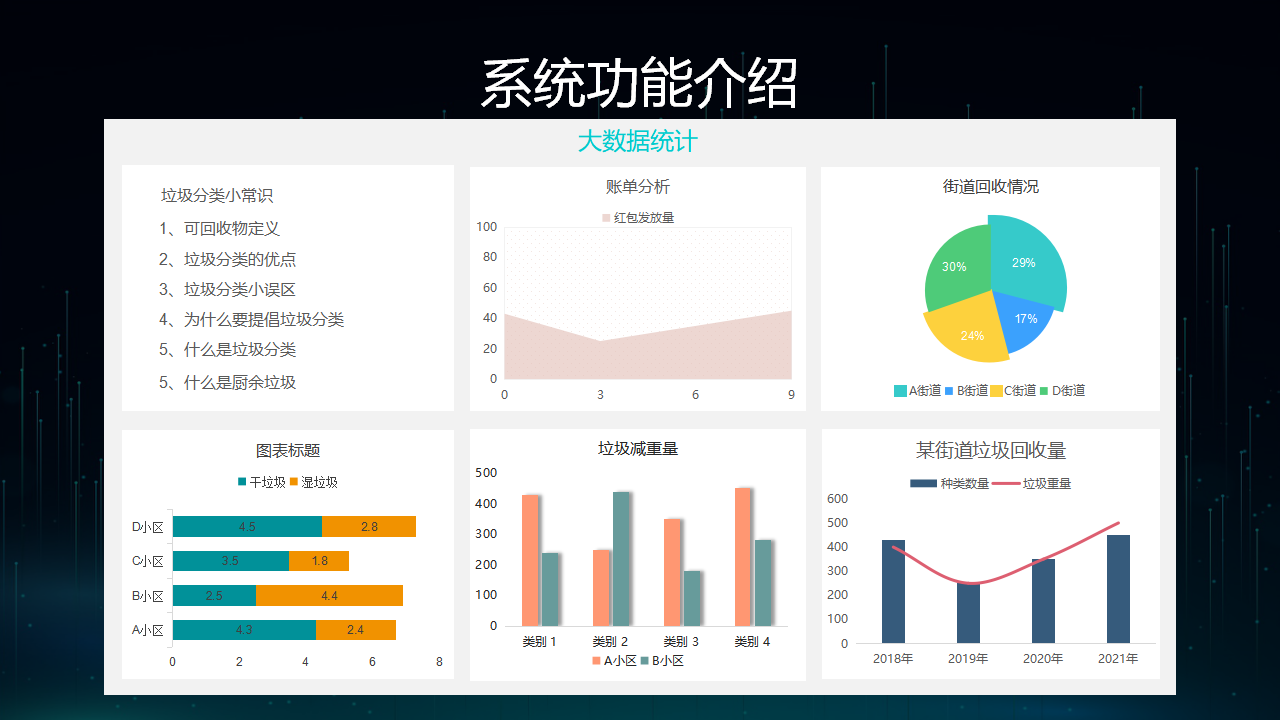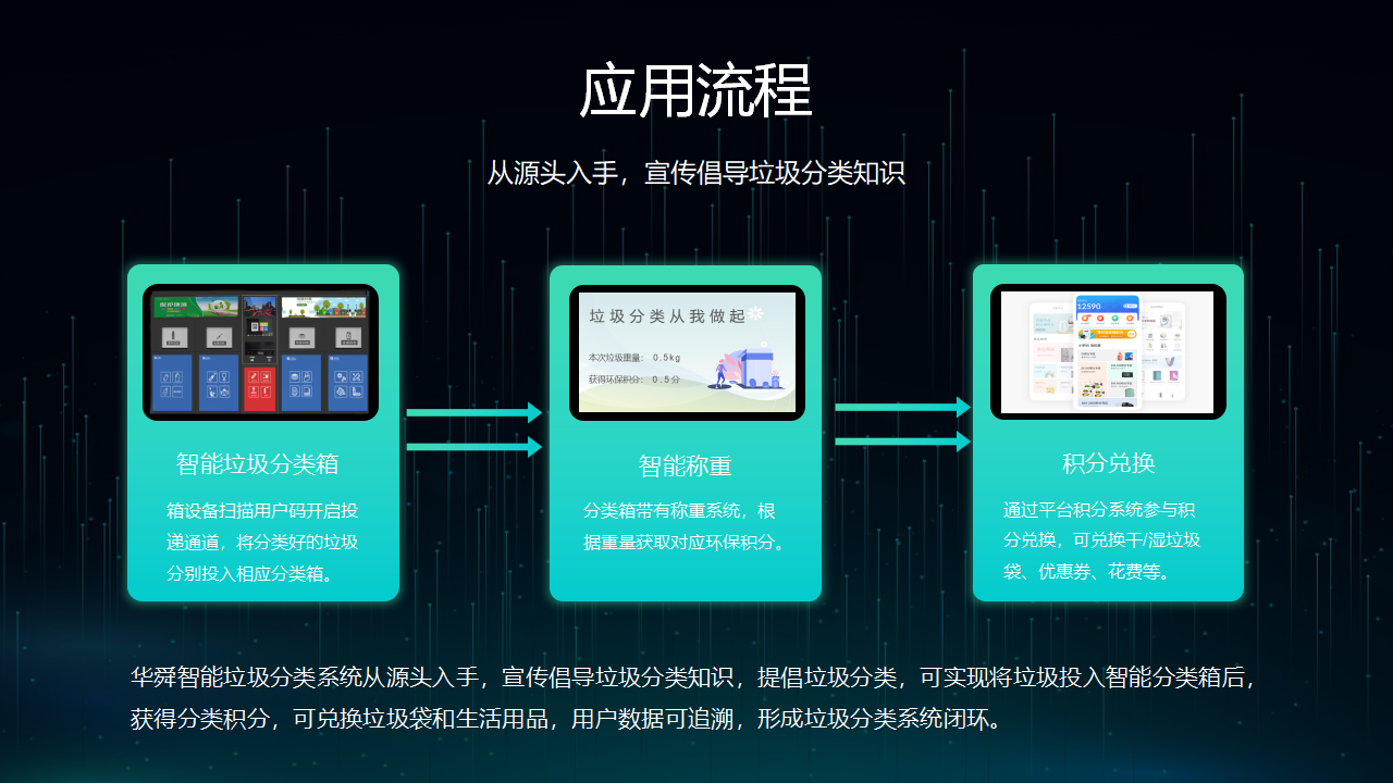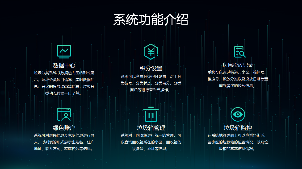 垃圾分类系统是通过大数据、人工智能和物联网等先进技术解决智能垃圾分类问题,系统通过线下宣导和线上APP运营激励,调动用户参与积极性,改变用户的垃圾分类习惯,减少对环境的污染破坏。