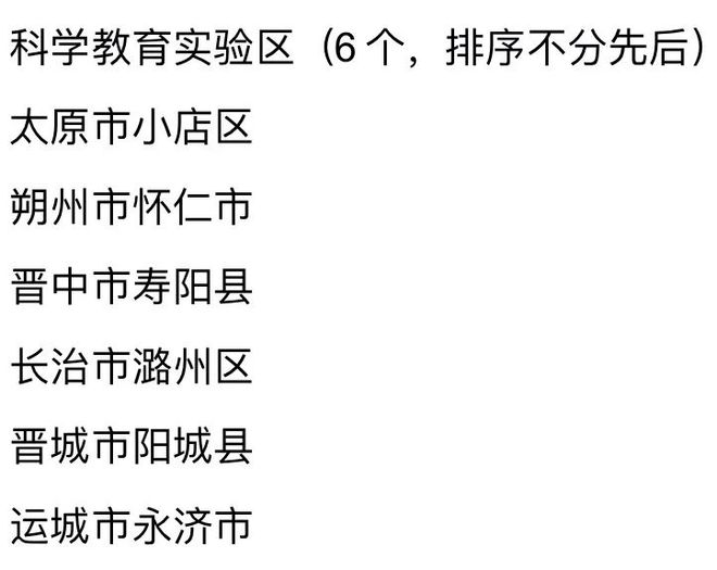 4月25日,山西省教育厅公示(公示期至4月30日)《山西省第二批全国中小学科学教育实验区、实验校推荐名单》,公示如下。实验区名单——