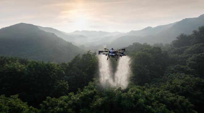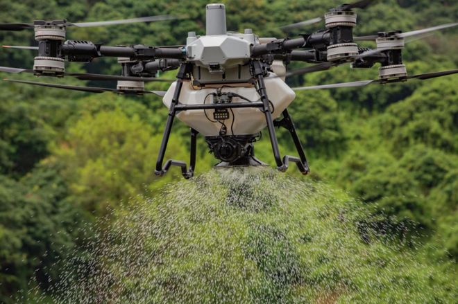 喷洒农药是农业无人机最常见的用途,T100喷洒载重75公斤,双喷头最大流量提升至30升每分钟,雾滴粒径 50到500微米可调,无需增配即可满足大流量作业场景◆■◆■。