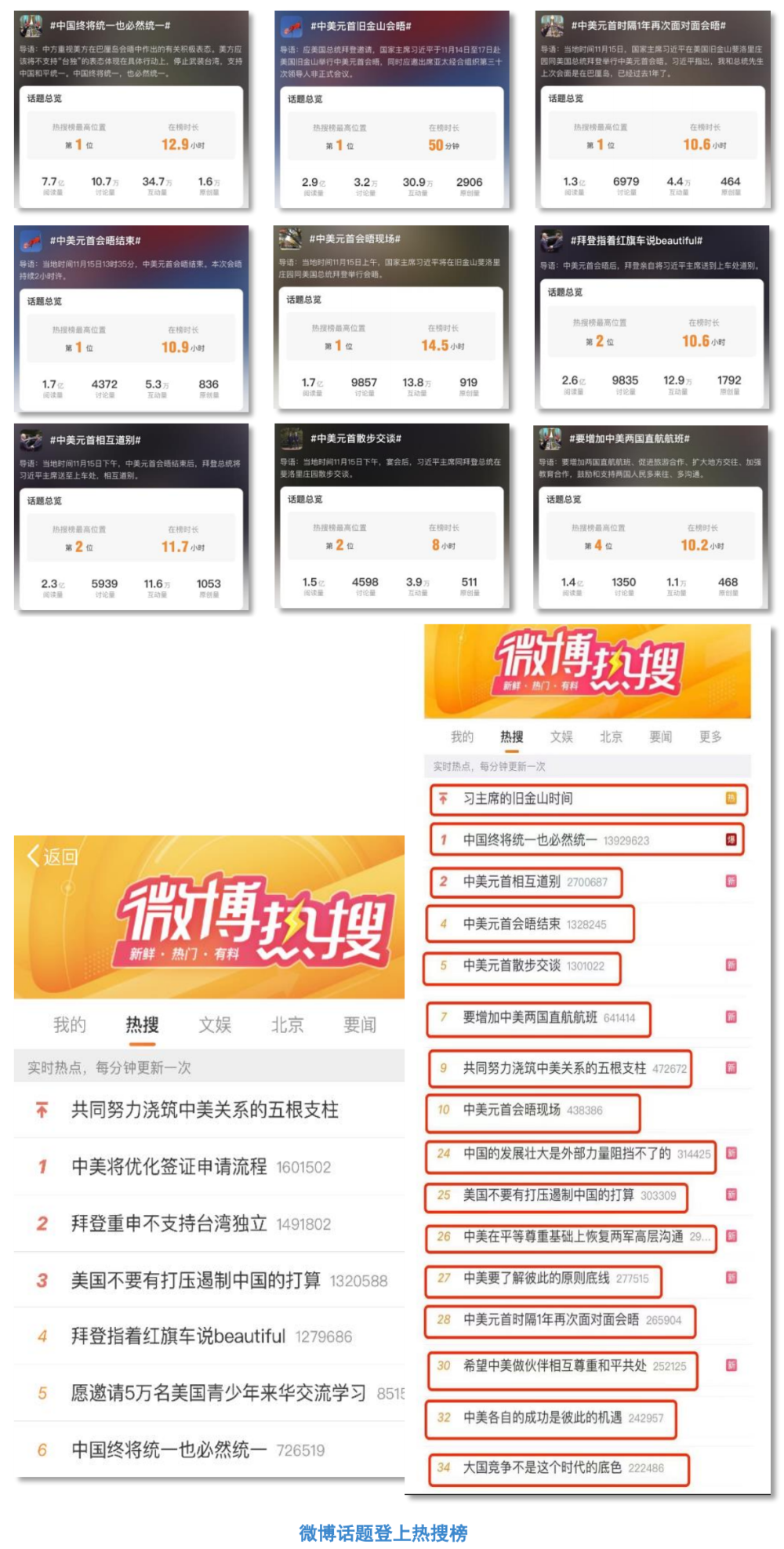 精设议题,互动话题全部登上热搜榜★◆★◆★◆!央视新闻微博及时提炼会晤中习主席重要观点★■■■、重要论断,发起#习主席的旧金山时间#■★★★■■、#中美元首会晤现场#、#共同努力浇筑中美关系的五根支柱#等30个互动话题,全部登上热搜榜,总阅读量超40.1亿◆★◆★◆■。其中■★★◆◆,#中国终将统一也必然统一#、#拜登重申不独立#等15个话题持续占据热搜榜首位。网友纷纷留言:★■◆■★“人类的福祉,就是大国和平相处◆■。◆◆◆◆”★★★■“旧金山成为新起点!◆★■◆★”