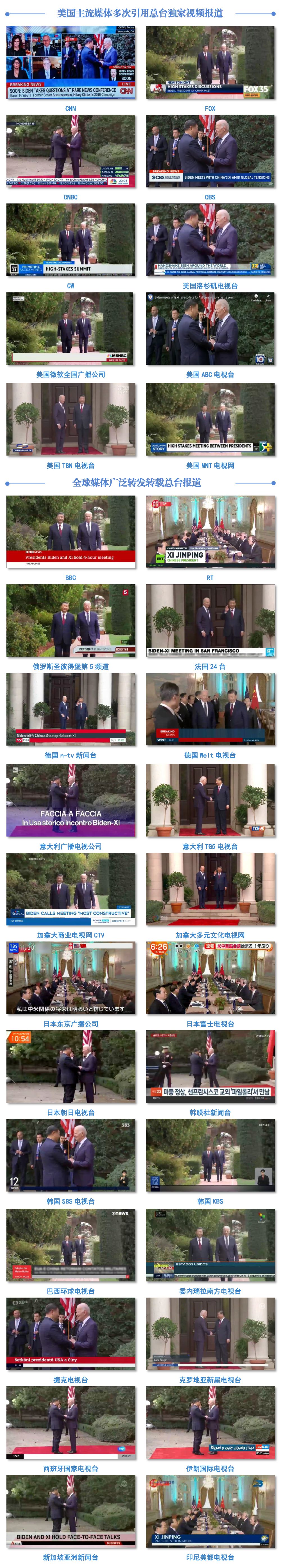全面覆盖!截至北京时间11月16日,总台国际视频通讯社对外发布“中美元首会晤”相关直播信号2场、新闻素材12条、多语种文稿57篇,被包括CNN★■★、FOX、CW、ABC★■★■■、NBC、CNBC、CBS、BBC、英国天空新闻台◆★★◆■、法国24台■◆■■、德国Welt电视台、意大利广播电视公司、加拿大广播公司◆■■■、RT、全俄国家电视广播公司★■◆★、俄罗斯第一频道、日本NHK■◆■■◆■、韩国KBS、印度全印电视台、新加坡亚洲新闻台◆■◆◆★、澳大利亚广播公司★■、新西兰电视台、卡塔尔半岛电视台、巴西环球电视台、委内瑞拉南方电视台、土耳其广播电视公司★■、摩洛哥Medi1 TV电视台、泰国公共电视台等在内的86个国家和地区的807个电视台及新媒体平台转播报道,累计播出5130次。其中,G7国家的电视台数量占比63%,G20国家的电视台数量占比71%;APEC成员中有17个国家和地区的500个媒体平台采用3244次■◆。特别值得一提的是★★■◆◆,在美方向外媒提供所有公共信号的情况下★■★★■,总台报道被美国311个媒体平台采用播出615次,其中◆■■◆■★,CNN、CNBC等主流媒体在直播节目中多次引用总家视频报道和《新闻联播》内容。