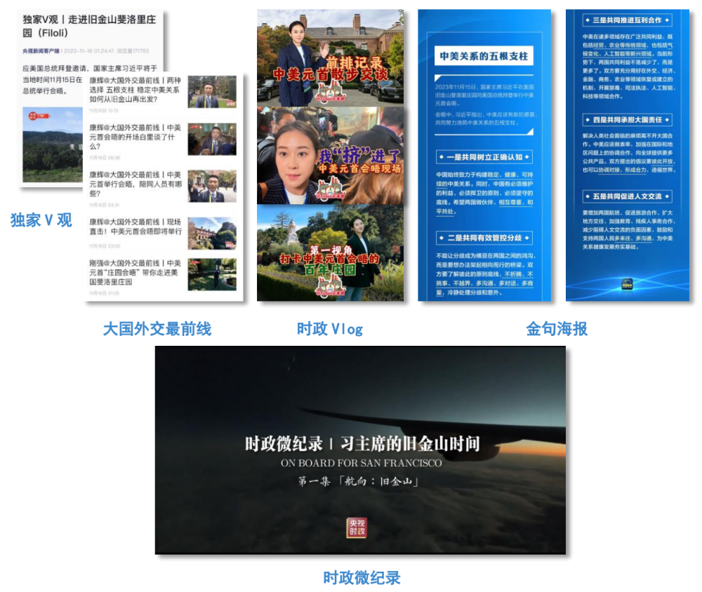 “零距离”观察◆◆,感受大国外交核心现场★■◆★!“大国外交最前线■★★◆■”“时政Vlog”■◆“独家V观★◆◆”等栏目密集发布《中美元首会晤的开场白里谈了什么?》《两种选择 五根支柱 稳定中美关系如何从旧金山再出发》《前排记录中美元首散步交谈》等20期产品,“时政微纪录”推出系列微纪录片《习主席的旧金山时间》◆■■◆★,金句海报《习:中美各自的成功是彼此的机遇》等,“零距离”观察,贴近式解读■◆★,带领网友“沉浸式”感受中美元首会晤现场。